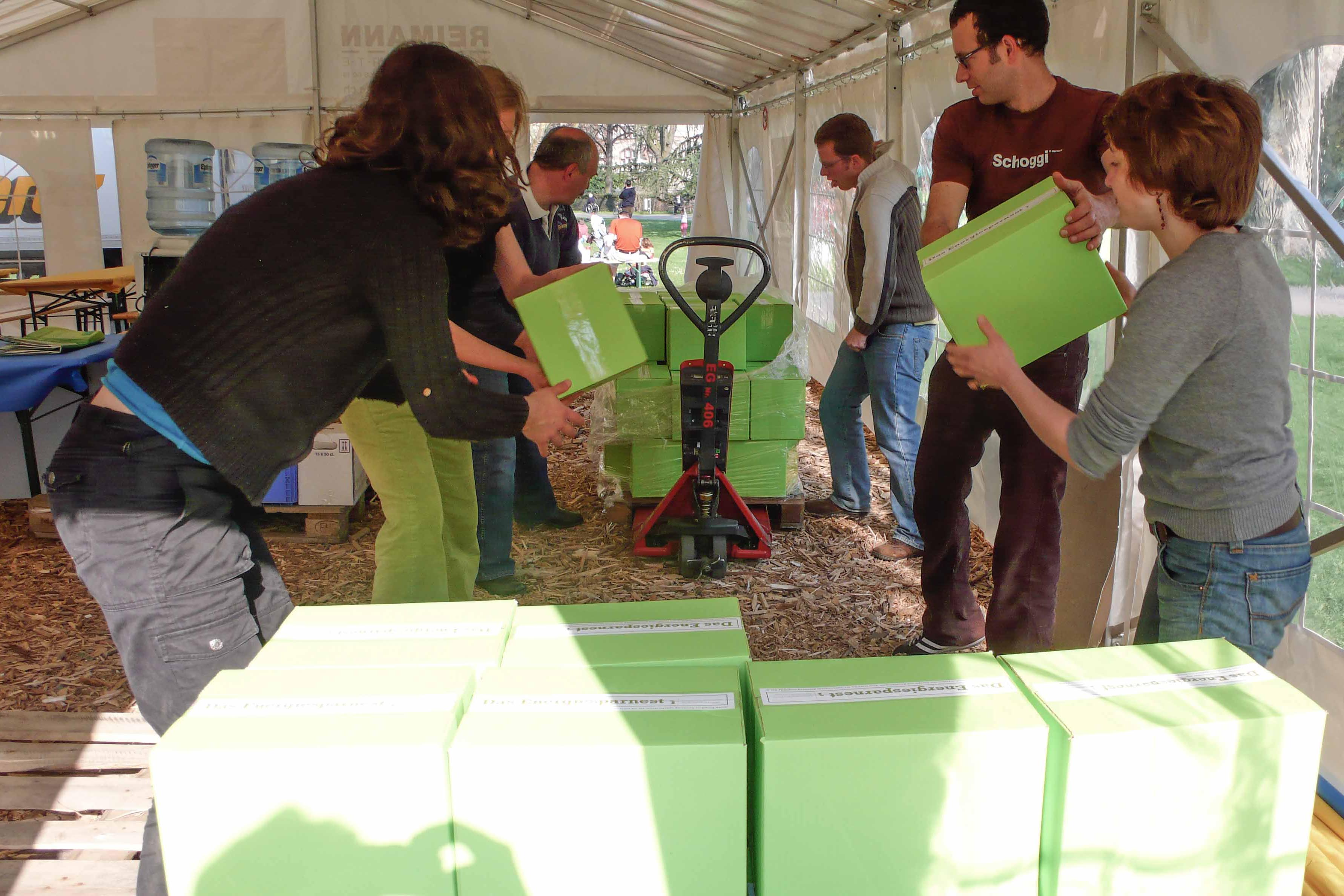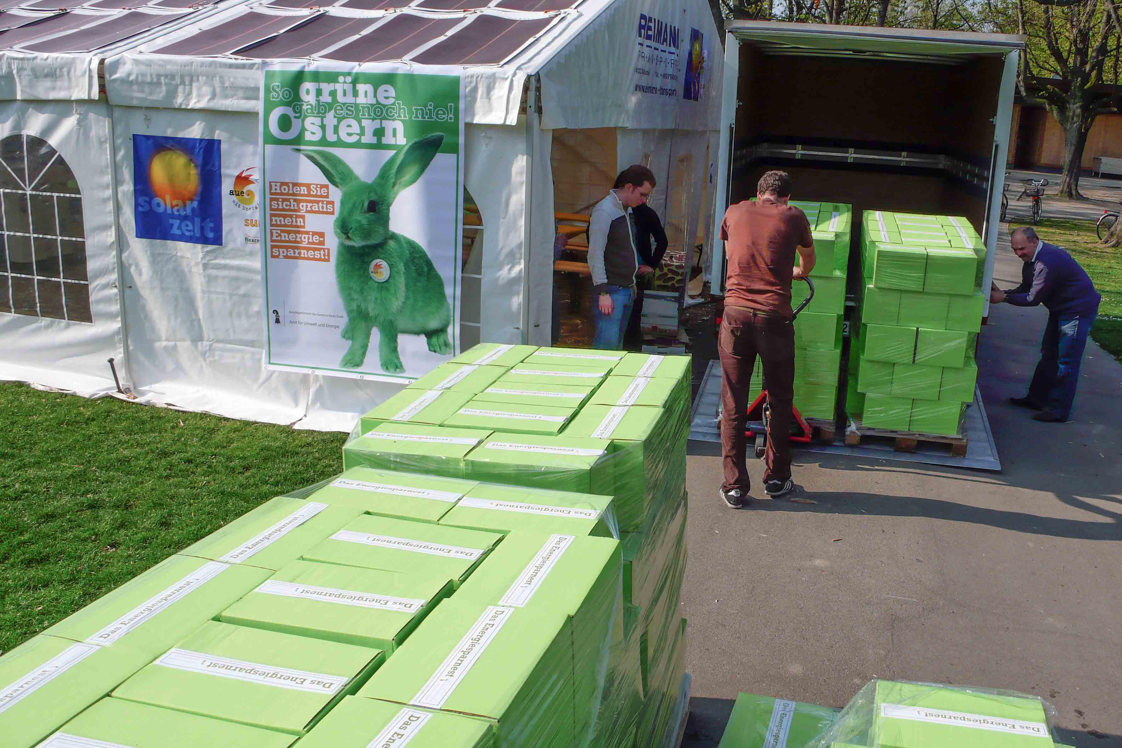 Am Osterwochenende 2007 versteckten wir im Auftrag des Amts für Umwelt und Energie (AUE) im Basler Schützenmattpark 1000 Ostereier aus Blech. Diese tauschten die glücklichen Finder im Solarzelt gegen ein kostenloses «Energiesparnest» ein. Darin fanden sie ein Dutzend Produkte zum Energiesparen und umweltfreundlichen Haushalten, wie etwa Wassersparsets, Steckerleisten oder Sparlampen. Ziel der Aktion war es, die Bevölkerung Basels für mehr Energieeffizienz und Wohnökologie zu gewinnen und ihnen die nötigen Produkte gleich in die Hand zu geben. Die Aktion löste ein grosses positives Echo aus.